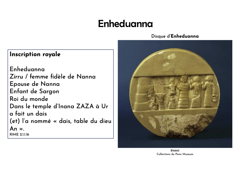 | Enheduanna : princesse de l’Empire d’Akkad et grande prêtresse du dieu Nanna, a vécu en Mésopotamie vers 2300 avant JC, poétesse, autrice d’hymnes à la déesse Inana, faisant d’elle la plus ancienne écrivain.e de l’histoire de l’humanité, tous sexes confondus |